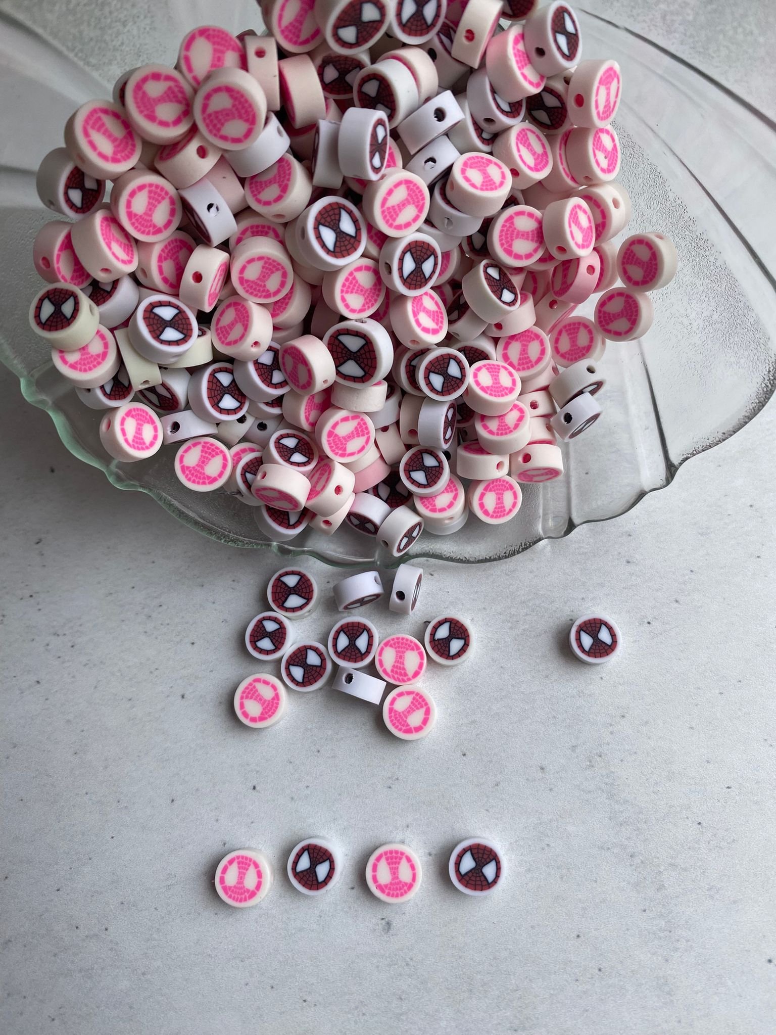 20 unidades de cuenta de arcilla (10 de Spiderman y 10 de Spider-Gwen) Son realizadas a mano por lo cual cada cuenta puede variar entre si.