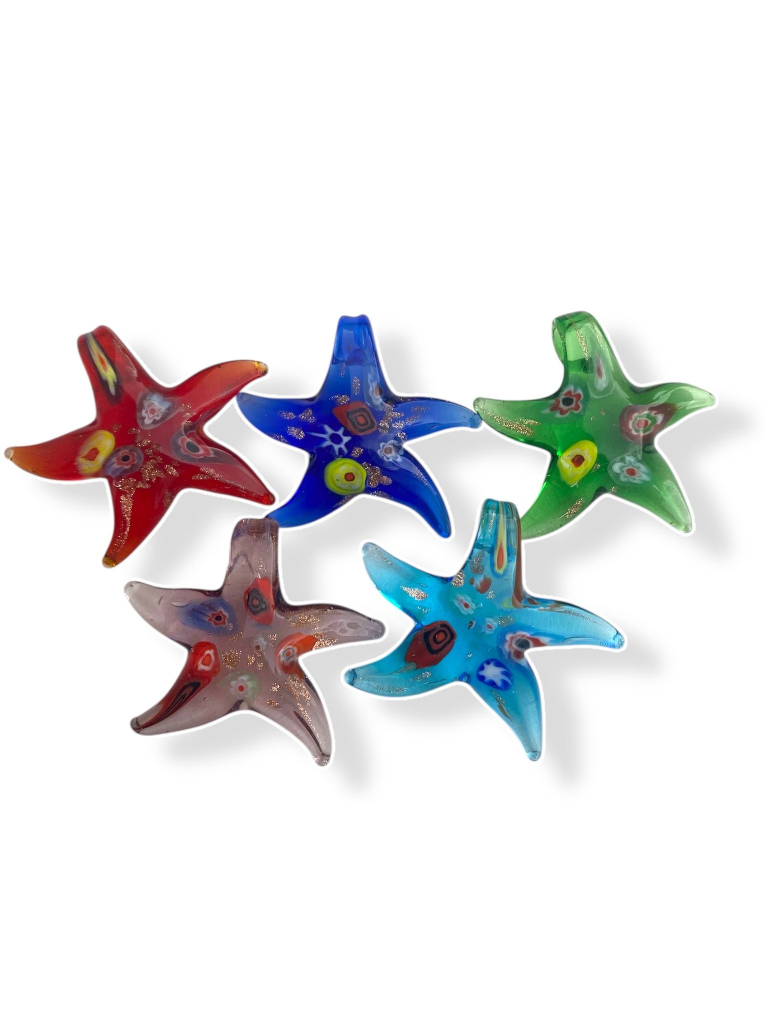 Colgantes artesanales de vidrio soplado, con arena dorada y millefiori, estrellas de mar, colores mixtos.